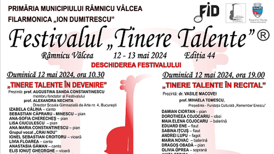 Duminică, 12 mai și luni, 13 mai, Filarmonica "Ion Dumitrescu" din Râmnicu Vâlcea găzduiește ediția cu numărul 44 a Festivalului Tinere Talente - cel mai longeviv festival de muzică cultă din România, organizat pentru tinerii muzicieni.