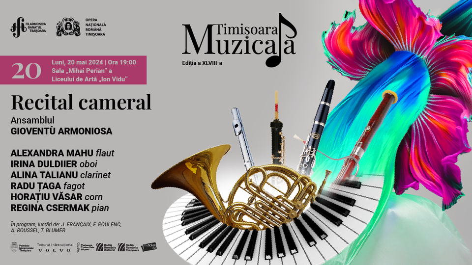 Primul dintre ele are loc chiar în această seară, de la ora 19:00, la Sala "Mihai Perian" a Liceului de Artă "Ion Vidu" Timișoara. Este vorba despre recitalul susținut de Ansamblul Gioventù Armoniosa. Artilștii Alexandra Mahu - flaut, Idina Dudliier - oboi, Alina Talianu - larinet, Radu Țaga - fagot, Horațiu Văsar - corn și Regina Csermak - pian vor interpreta lucrări de: J. FRANÇAIX, F. POULENC, A. ROUSSEL și T. BLUMER.