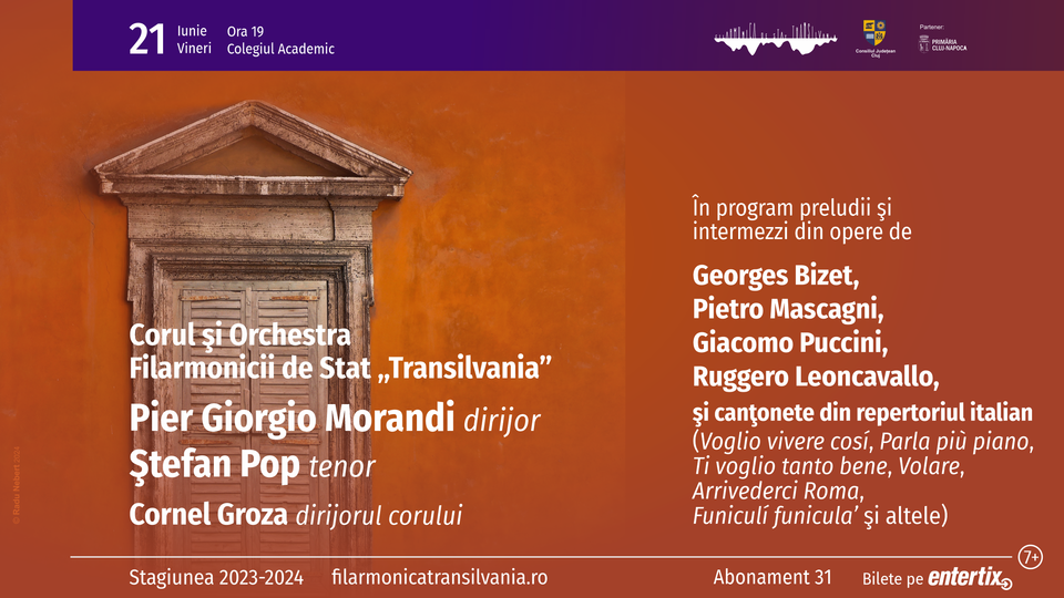 Vineri, 21 iunie 2024, vă invităm la un concert cu iz de vară, care vă va purta peste mări și țări până în însorita Italie. Sărbătoriți Ziua europeană a muzicii împreună cu noi și invitații noștri dirijorul Pier Giorgio Morandi și tenorul Ștefan Pop, alături de Cornel Groza, dirijorul corului. O serie de preludii și intermezzi din opere de Georges Bizet, Pietro Mascagni, Giacomo Puccini, Ruggero Leoncavallo, precum și canțonete celebre din repertoriul italian (Voglio vivere cosí, Parla più piano, Ti voglio tanto bene, Volare, Arrivederci Roma, Funiculì, Funiculà) vor răsuna pe scena din Auditorium Maximum, începând cu ora 19.00.