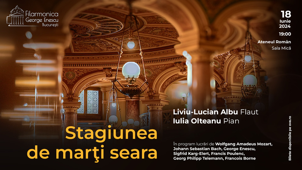La Ateneu, în Sala Mică, Stagiunea de marți seara are programat recitalul de flaut și pian care va fi oferit de flautistul Liviu-Lucian Albu și pianista Iulia Olteanu.