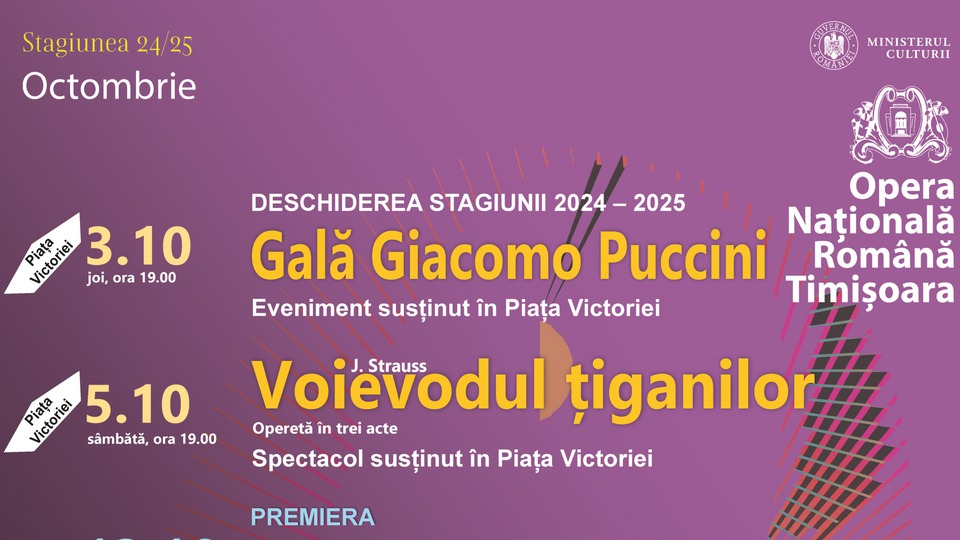 Opera Națională Română din Timișoara deschide stagiunea 2024-2025, în aer liber (în Piața Victoriei) cu Gala Giacomo Puccini, la data de 3.10.2024, ora: 19.00 - un omagiu adus marelui compozitor italian și la data de 5.10.2024, ora: 19.00 tot în Piața Victoriei continuăm cu opereta "Voievodul țiganilor" de Johann Strauss.