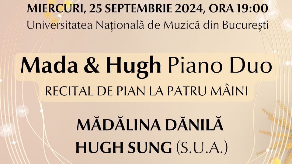 Pe scena Sălii „George Enescu” a Universității Naționale de Muzică din București are loc astăzi, 25 septembrie, începând cu ora 19:00, un recital susținut de duoul pianistic format din Mădălina Dănilă și Hugh Sung.