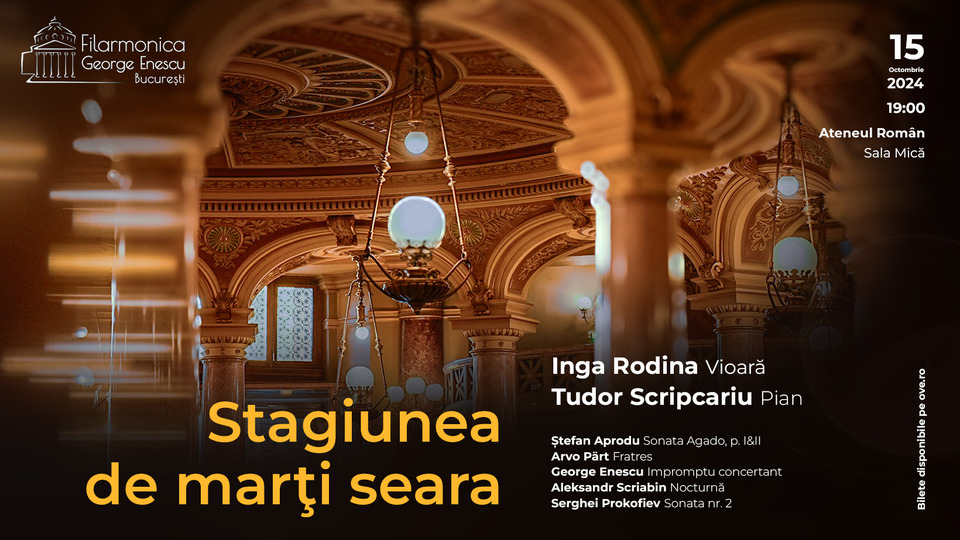 Stagiunea de marți seara a Filarmonicii "George Enescu" din București se deschide astăzi, 15 octombrie 2024, cu un recital susținut de violonista Inga Rodina și pianistul Tudor Scripcariu.