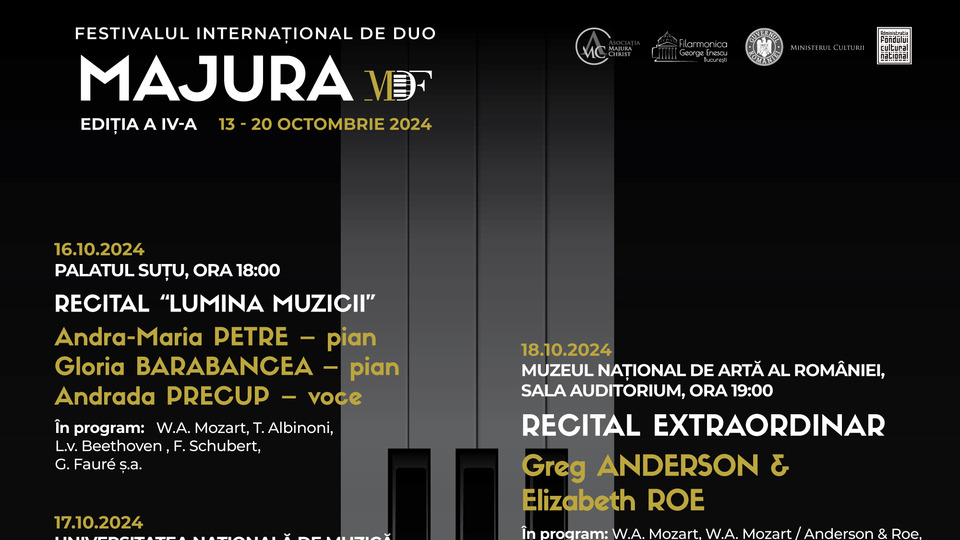 Cea de-a patra ediție a Festivalului Internațional de Duo Majura se află în plină desfășurare. În cadrul acesteia, astăzi, 16 octombrie 2024, de la ora 18.00, la Palatul Suțu din capitală va avea loc un recital intitulat "Lumina muzicii", susținut de două interprete nevăzătoare - pianista Andra Maria Petre și vocalista Andrada Precup, câștigătoarea X Factor România 2020, alături de pianista Gloria Barabancea.