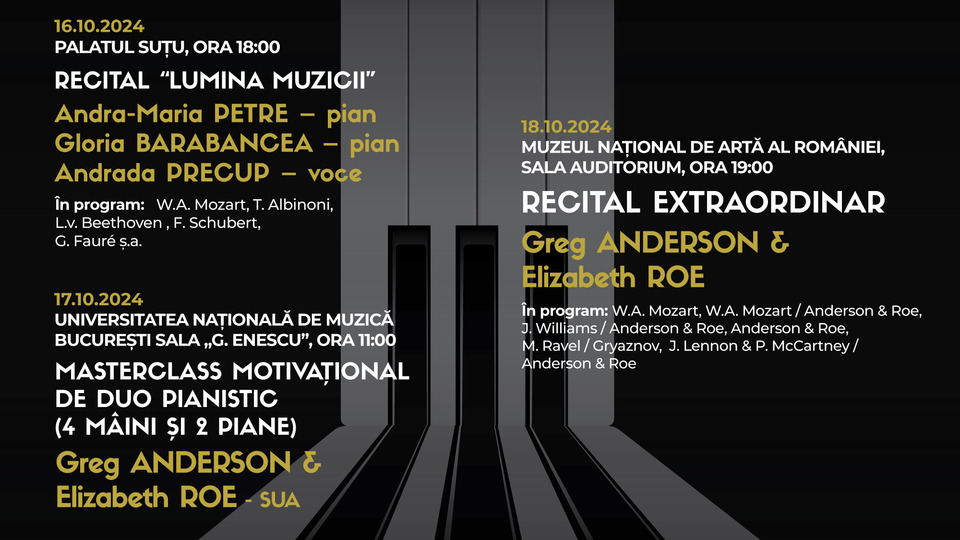 Pianiștii Greg Anderson și Elisabeth Roe din Statele Unite ale Americii vor putea fi ascultați și vineri, 18 octombrie, de la ora 19.00, într-un recital găzduit de Muzeul Național de Artă al României, iar în 20 octombrie cei doi artiști vor susține, la Ateneul Român, un concert alături de Orchestra Camerata Regală, sub bagheta dirijorului Cristian Mandeal.