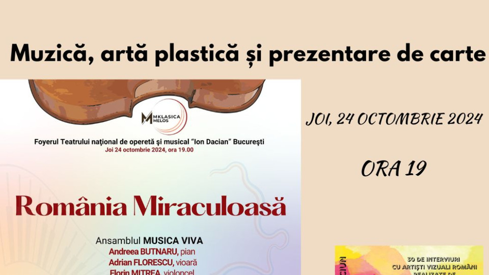 Puteți descoperi România Miraculoasă într-un mod muzical, inedit și interactiv, înfățișată de Ansamblul Musica Viva, în seara de joi, 24 octombrie 2024, începând cu ora 19.00, la Teatrul Național de Operetă și Musical "Ion Dacian" din București.