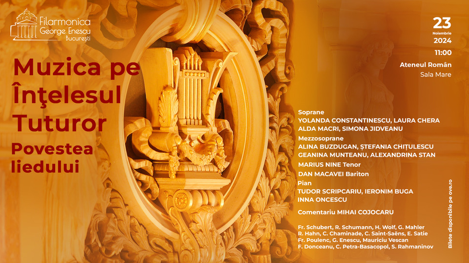 Filarmonica "George Enescu" prezintă astăzi, 23 noiembrie 2024, un nou eveniment din seria "Muzica pe înțelesul tuturor", intitulat "Povestea liedului", dar și recitalul cameral susținut de Trioul "Alpha".