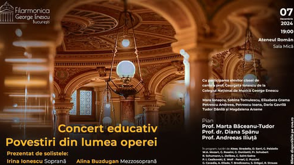 Începând cu ora 19:00, la Sala Mică are loc concertul educativ "Povestiri din lumea operei", propus de elevii clasei de canto a prof. Georgeta Ionescu de la Colegiul Național de Muzică "George Enescu". Participă, între alții Tudor Dănilă, Mara Ionașcu, Sabina Tomulescu, Elisabeta Grama. Din program fac parte lucrări de Giovanni Paisiello, Wolfgang Amadeus Mozart, Gioachino Rossini, Gaetano Donizetti și Franz Schubert.