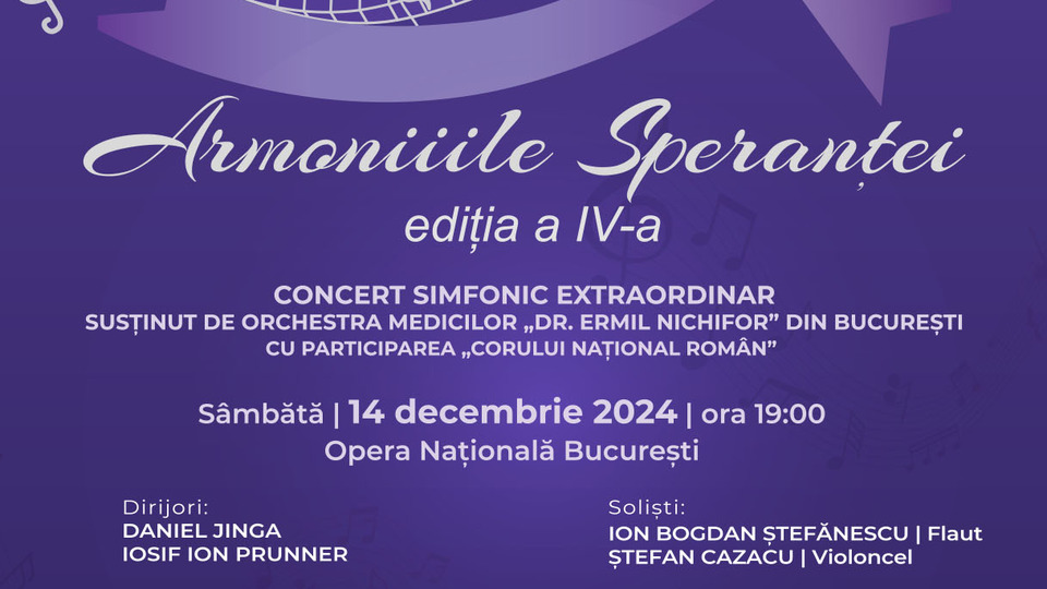 Cea de-a patra ediție a concertului caritabil "Armoniile Speranței", susținut de Orchestra Medicilor "Dr. Ermil Nichifor" și Corul Național Român, se va desfășura astăzi, 14 decembrie 2024, pe scena Operei Naționale din București.