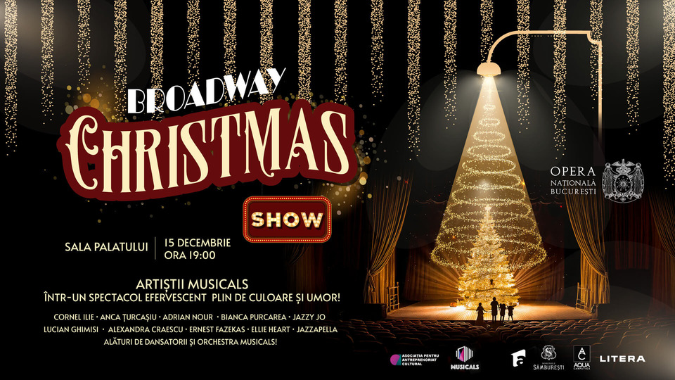 Tot astăzi, 15 decembrie 2024, la Sala Palatului are loc spectacolul "Broadway Christmas Show", o coproducție a Operei Naționale București și "Musicals". Evenimentul, prezentat în premieră, urmărește povestea unei familii numeroase care se pregătește pentru cea mai așteptată sărbătoare. Spectacolul îmbină muzica, dansul, actoria și momente de comedie. Participă, printre alții, artiștii Cornel Ilie, Anca Țurcașiu, Adrian Nour, Bianca Purcărea, formația "Jazzapela", precum și dansatorii și orchestra "Musicals". Ora de începere este 19.00.