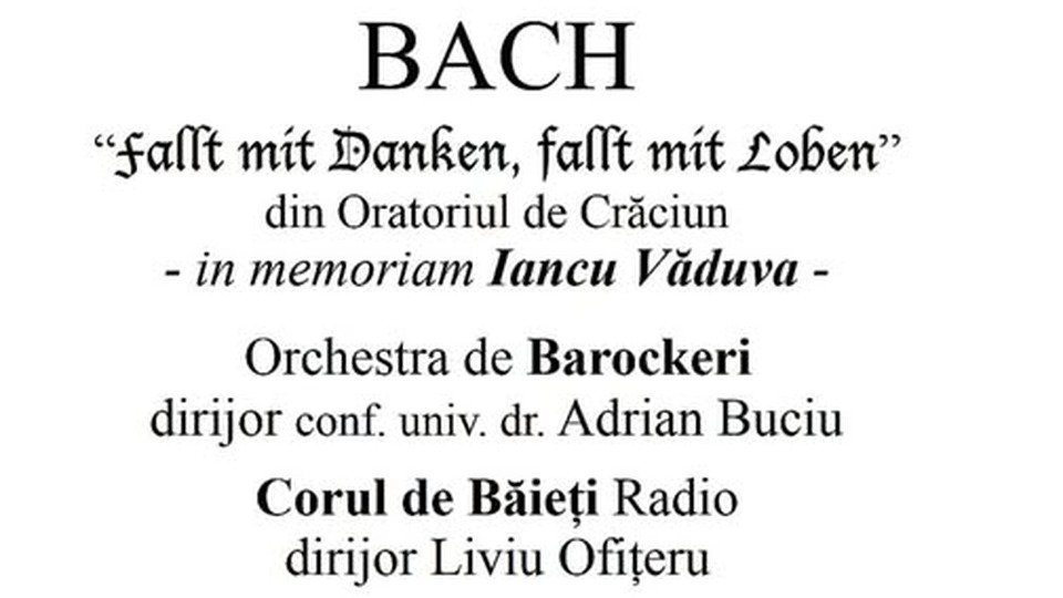 În program: "Fallt mit Danken, fallt mit Loben" din "Oratoriul de Crăciun" de Johann Sebastian Bach, cu participarea Corului de Băieți Radio pregătit de dirijorul Liviu Ofițeru, soliști fiind sopranistul Șerban Șușnea, tenorul Adrian Mihalcea și baritonul Dan Macavei. În continuare, publicul poate asculta Pastorala de Domenico Zipoli, cu Andi Zhu la orgă și Concertul în mi major pentru contrabas și orchestră de Carl Ditters von Dittersdorf, cu Iacob Panighianț - solist.
