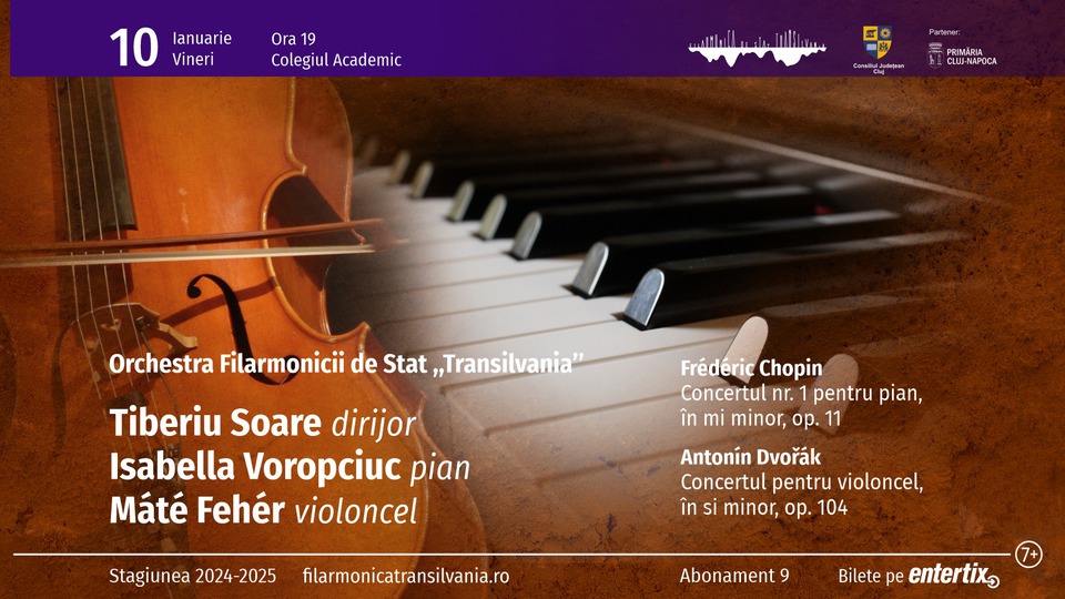Doi tineri soliști sunt protagoniștii concertului de astăzi, 10 ianuarie 2025, de la Filarmonica de Stat "Transilvania": pianista Isabella Voropciuc și violoncelistul Máté Fehér.