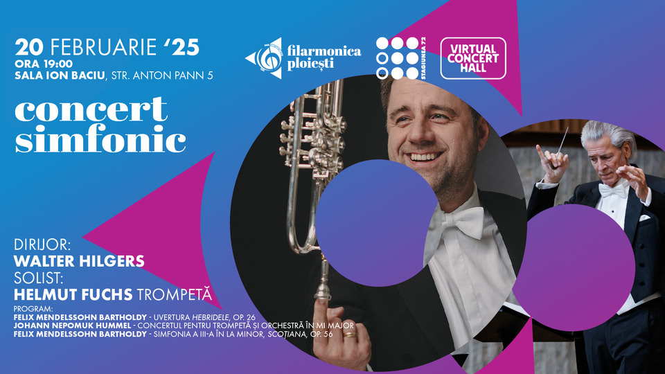 Începând cu ora 19:00, publicul poate asculta Concertul pentru trompetă și orchestră în mi major de Johann Nepomuk Hummel, cu Helmut Fuchs solist și două lucrări semnate de Felix Mendelssohn, Uvertura "Hebridele" op. 26, respectiv Simfonia a III-a în la minor "Scoțiana" op. 56.