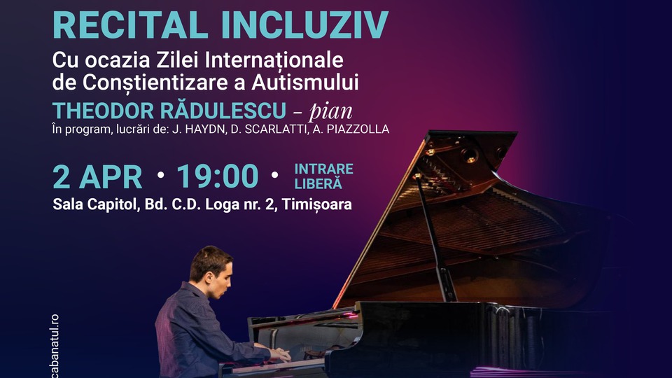 Filarmonica "Banatul" Timișoara, în parteneriat cu Asociația "Copii și Zâne" organizează astăzi, 2 aprilie 2025, un recital de pian pentru a marca Ziua Internațională de Conștientizare a Autismului.