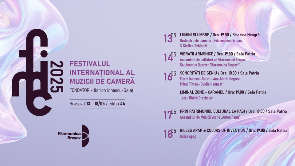 Festivalul Internațional al Muzicii de Cameră, ajuns la cea de-a 44-a ediție, continuă astăzi, 17 mai 2025, printr-un concert intitulat "Prin patrimoniul muzical, la pas!", care se desfășoară pe scenă Sălii Patria, la Brașov.