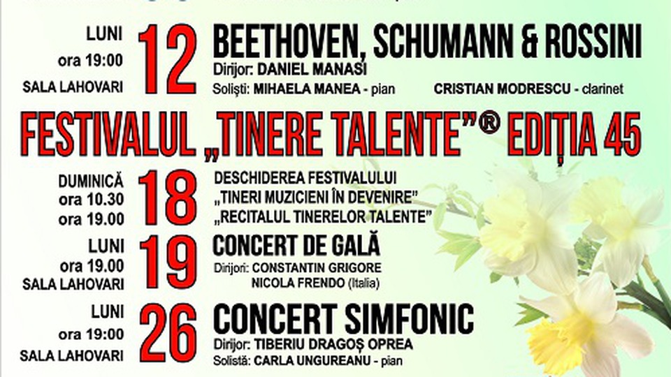 În perioada 18-19 mai se desfășoară la Râmnicu Vâlcea Festivalul „Tinere Talente”, un eveniment ce are ca scop promovarea tinerilor interpreți, elevi la școlile și liceele de muzică din țară. Ajuns la ediția cu numărul 45, sub egida Filarmonicii „Ion Dumitrescu”, Festivalul are în programul acestei zile de 18 mai doua evenimente la Sala Lahovari: recitalul „Tineri muzicieni în devenire” începând cu orele 10:30 și „Recitalul Tinerelor Talente” propuse de Fundația Culturală „Remember Enescu” de la orele 19:00.