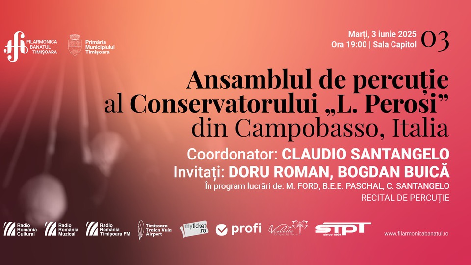 La Filarmonica „Banatul" din Timișoara va avea loc astăzi, 3 iunie 2025, un recital susținut de Ansamblul de Percuție al Conservatorului „Lorenzo Perosi” din Campobasso, Italia, coordonat de Claudio Santangelo. În programul serii sunt anunțate pagini semnate de Michael Ford, Brett Paschal și Claudio Santangelo. Invitați: Doru Roman și Bogdan Buică. Evenimentul începe la 19:00 și se desfășoară la Sala Capitol a instituției timișorene.