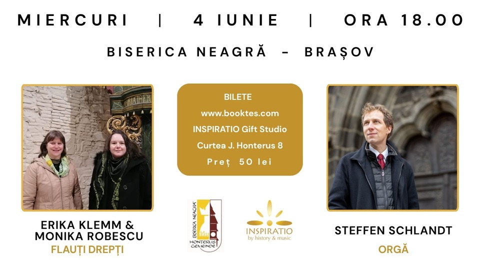 Biserica Neagră din Brașov găzduiește astăzi, 4 iunie 2025, un concert de flaut baroc și orgă. Flautistele Erika Klemm, Monika Robescu și organistul Steffen Schlandt propun un program ce reunește creații din Baroc compuse de Giovanni Battista Pergolesi, Dario Castello, Georg Philipp Telemann și Antonio Vivaldi. Ora de începere este 18:00.