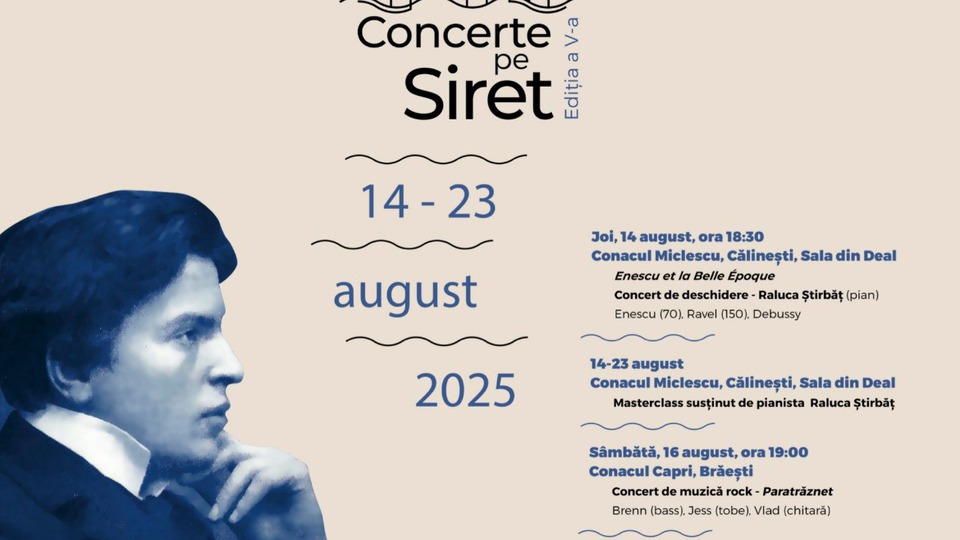 Festivalul "Concerte pe Siret", ediția a V-a, se încheie astăzi, 23 august 2025. Evenimentul final îi aduce în fața publicului pe tinerii pianiști participanți la masterclass-ul susținut de către pianista Raluca Știrbăț.