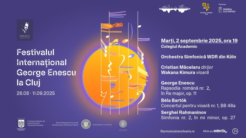Marți, 2 septembrie 2025, ora 19.00, melomanii sunt invitați în sala Auditorium Maximum a Colegiului Academic pentru a participa la un regal muzical, reprezentând cel de-al treilea concert de pe agenda Festivalului Internațional George Enescu la Cluj. Renumitul dirijor Cristian Măcelaru se va afla la pupitrul Orchestrei Simfonice WDR din Köln, din programul serii făcând parte lucrări precum George Enescu - Rapsodia română nr. 2, în Re major, op. 11, Béla Bartók - Concertul pentru vioară nr. 1, BB 48a (solistă violonista japoneză Wakana Kimura) și Serghei Rahmaninov - Simfonia nr. 2, în mi minor, op. 27.