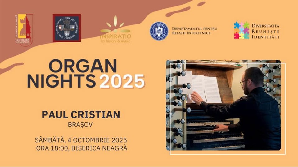 Astăzi, 4 octombrie 2025, de la ora 18:00, Biserica Neagră din Brașov găzduiește un nou concert din cadrul stagiunii Organ Nights 2025, susținut de organistul Paul Cristian.