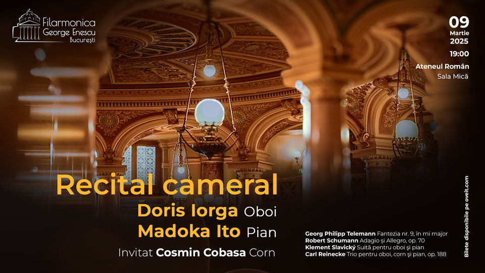 Oboista Doris Iorga și pianista Madoka Ito evoluează în această seară de 9 martie 2025 pe scena Sălii Mici a Ateneului Român. Invitat special al serii este cornistul Cosmin Cobasa. Programul propus cuprinde Fantezia nr. 9 în mi major de Georg Philipp Telemann, Adagio și Allegro op. 70 din creația lui Robert Schumann, Suita pentru oboi și pian semnată de Klement Slavickę și Trio pentru oboi, corn și pian op. 188 de Carl Reinecke.
