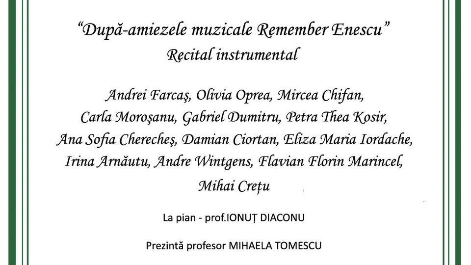 Prezintă profesoara Mihaela Tomescu. Evenimentul intitulat "După-amiezele muzicale Remember Enescu" se desfășoară cu începere de la ora 17:30.