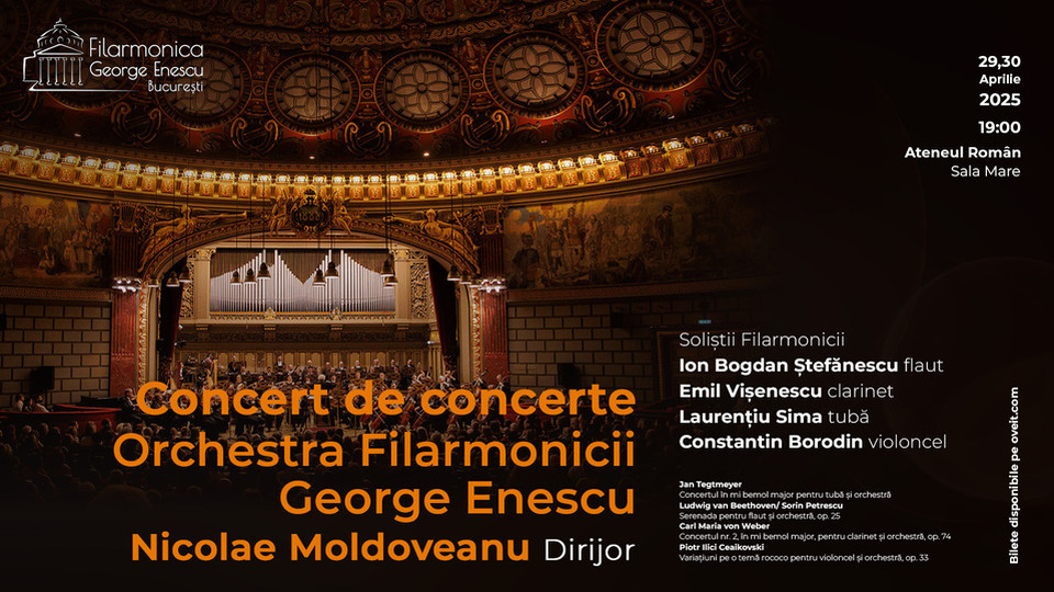 Orchestra Filarmonicii „George Enescu” propune încă o dată astăzi, 30 aprilie 2025, un „Concert de concerte”. În ipostază solistică evoluează flautistul Ion Bogdan Ștefănescu, clarinetistul Emil Vișenescu, tubistul Laurențiu Sima și violoncelistul Constantin Borodin. Programul reunește Concertul în mi bemol major pentru tubă și orchestră semnat de Jan Tegtmeyer, Serenada op. 25 pentru flaut și orchestră de Ludwig van Beethoven, în aranjamentul lui Sorin Petrescu, Concertul nr. 2 op. 74 în mi bemol major pentru clarinet și orchestră din creația lui Carl Maria von Weber și Variațiuni pe o temă rococo op. 33 pentru violoncel și orchestră de Piotr Ilici Ceaikovski. La pupitrul dirijoral se va afla Nicolae Moldoveanu.