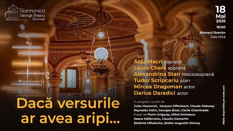 Duminică, 18 mai, Ateneul Român găzduiește recitalul de muzică și poezie intitulat „Dacă versurile ar avea aripi…" Vor evolua pe scenă la Sala Mică sopranele Alda Macri, Laura Chera, mezzosoprana Alexandra Stan, împreună cu pianistul Tudor Scripcariu și actorii Mircea Dragoman și Darius Daradici. Programul cuprinde lucrări semnate de Jules Massenet, Jaques Offenbach, Reynaldo Hahn, Georges Bizet și Cécile Chaminade alături de versuri recitate din creația unor poeți precum Mihai Eminescu, Florin Grigoraș, Ileana Mălăncioiu, Claudiu Komartin, Ștefania Mihalache și Ștefan Augustin Doinaș. Spectacolul începe la orele 19:00.