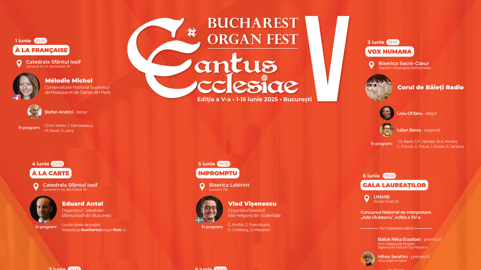 Unul dintre cele mai importante festivaluri dedicate muzicii de orgă din România se deschide astăzi, 1 iunie, la Catedrala Sfântul Iosif din București. Concertul din acestă seară este susținut de organista franco-americană Mélodie Michel și de tenorul Ștefan Andrici. Programul cuprinde lucrările „Salve Regina” de Oliver Latry, „Ubi Caritas” de Jeanne Demessieux și „Simfonia pentru orgă” nr. 5 op. 42 nr. 1 de Charles-Marie Widor. Evenimentul se desfășoară începând cu ora 20:00, iar intrarea este liberă. Festivalul Bucharest Organ Fest Cantus Ecclesiae ajuns la cea de a cincea ediție are loc în perioada 1-15 iunie în spații precum Catedrala Sfântul Iosif, Biserica Sacré-Coeur, Universitatea Națională de Muzică din București, Biserica Labirint, Biserica Evanghelică C.A., interpreții aducând la viață cele mai importante orgi din capitală. Programul cuprinde atât concerte de orgă, cât și alte recitaluri tematice, concerte educative, colaborări camerale, corale și cu soliști vocali, dar și un concert cu improvizație live pe un film mut. Printre artiștii invitați se enumeră: Sophie-Véronique Cauchefer-Choplin, Jean-Baptiste Robin, János Pálúr, interpreții români Maria-Luisa Antal, Eduard Antal și Daniel Nesimuca. Următoarele evenimente propuse se desfășoară pe 3 iunie la Biserica Sacré-Coeur, 4 iunie la Catedrala Sfântul Iosif și 5 iunie la Biserica Labirint.