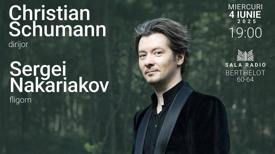 Celebrul trompetist Sergei Nakariakov evoluează în ipostază solistică în această seară de 4 iunie 2025 pe scena Sălii Radio. Muzicianul va interpreta Concertul nr. 4 KV 495 de Wolfgang Amadeus Mozart, într-un arnajament pentru fligorn și orchestră. Programul propus de Orchestra de Cameră Radio este completat de Uvertura Coriolan op.62 din creația lui Ludwig van Beethoven și de Simfonia a VI-a în do major de Franz Schubert. Conducerea muzicală va fi asigurată de Christian Schumann.