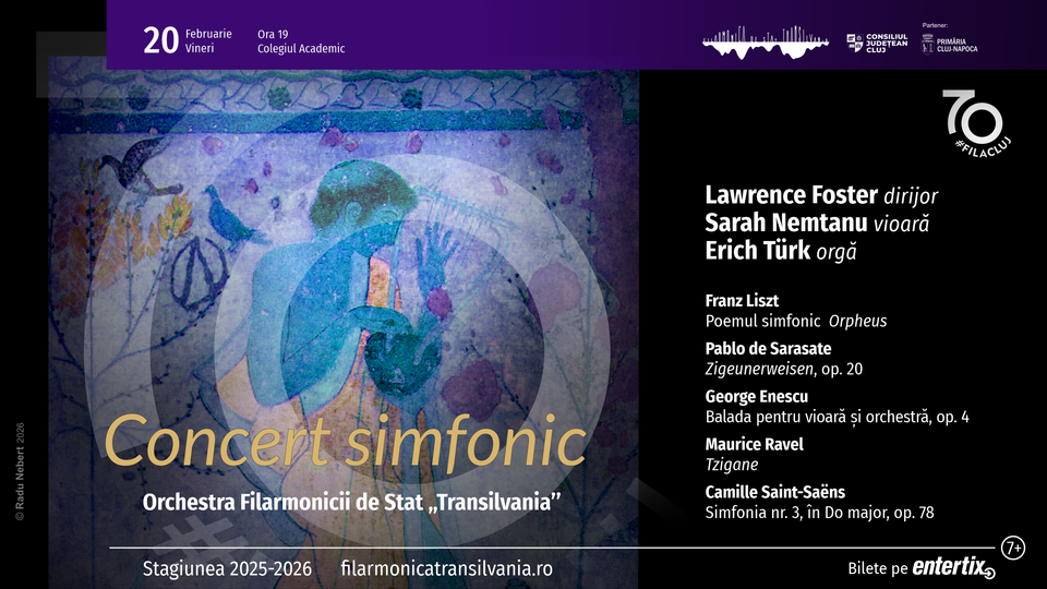 Franz Liszt, Pablo de Sarasate, George Enescu, Maurice Ravel și Camille Saint-Saëns sunt compozitorii ale căror creații vor fi prezentate melomanilor clujeni vineri, 20 februarie 2026, ora 19.00 / Colegiul Academic, în interpretarea soliștilor Sarah Nemtanu (vioară) și Erich Türk (orgă), alături de Orchestra Filarmonicii de Stat "Transilvania", sub bagheta Maestrului Lawrence Foster, Dirijor Emerit al Orchestrei Filarmonicii clujene.