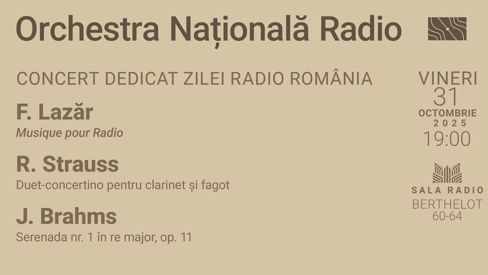 Sub bagheta dirijorului Cristian Oroșanu, Orchestra Națională Radio prezintă concertul aniversar devenit o tradiție a instituției. Veți asculta la Sala Radio Richard Strauss: Duet-concertino pentru clarinet și fagot (soliști: Adrian Duminică - clarinet și Ionuț Roșca - fagot) și Brahms: Serenada nr. 1. Evenimentul va aduce în atenția publicului și lucrarea Musique pour Radio, care va deschide programul serii, semnată de compozitorul român Filip Lazăr (1894, Craiova - 1936, Paris).