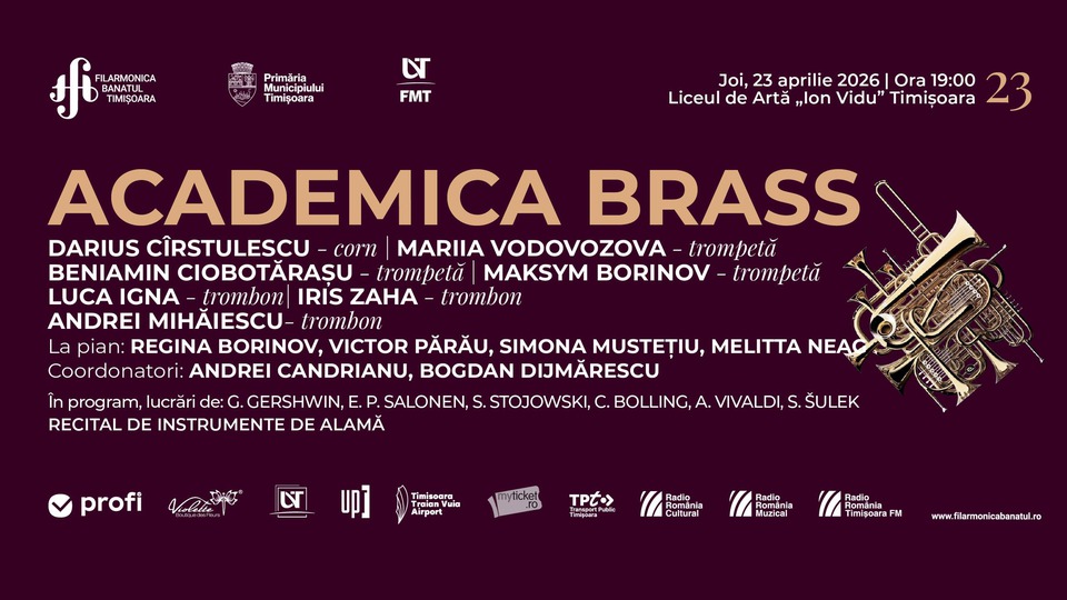 În organizarea Filarmonicii "Banatul", astăzi, 23 aprilie 2026, de la ora 19.00, la Liceul de Artă "Ion Vidu" din Timișoara, va avea loc un recital cameral susținut de Ansamblul de alămuri "Academica Brass" coordonat de Andrei Candrianu și Bogdan Dijmărescu.