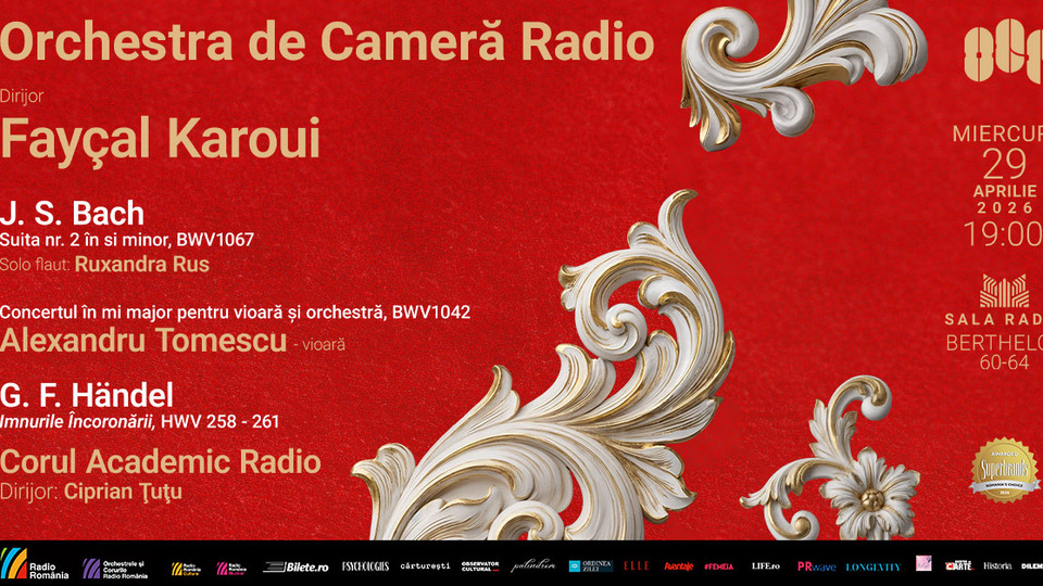 Miercuri, 29 aprilie 2026 (de la 19.00) aveți ocazia de a-l aplauda pe apreciatul violonist Alexandru Tomescu pe scena Sălii Radio. Alături de Orchestra de Cameră Radio și sub bagheta dirijorului-invitat Fayçal Karoui, violonistul român va interpreta Bach: Concertul în mi major pentru vioară și orchestră. În aceeași seară, veți mai asculta și Bach: Suita nr. 2 în si minor (solo flaut: Ruxandra Rus) și Händel: Imnurile încoronării, compuse pentru ceremonia de încoronare a regelui George al II-lea al Marii Britanii, desfășurată pe 11 octombrie 1727, la Westminster Abbey (Londra). Concertul se va derula cu participarea Corului Academic Radio (dirijor: Ciprian Țuțu).