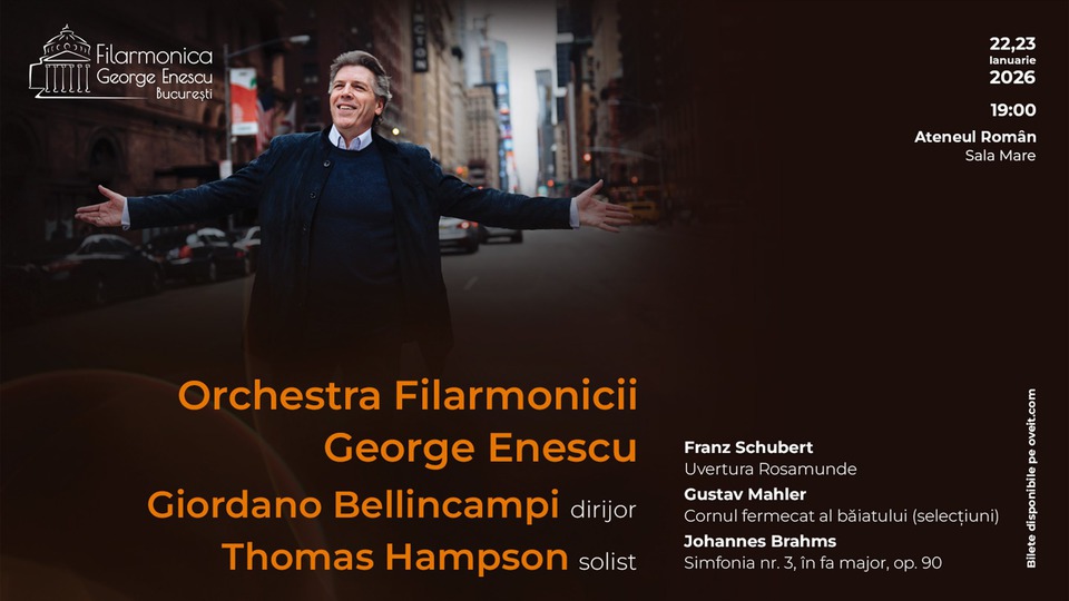 Celebrul bariton american Thomas Hampson și dirijorul danez de origine italiană Giordano Bellincampi revin astăzi, 23 ianuarie 2026, pe scena Ateneului Român.