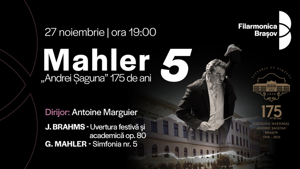 Joi, 27 noiembrie 2025, ora 19:00, Sala Mare a Filarmonicii Brașov găzduiește un concert aniversar dedicat celor 175 de ani de la fondarea Colegiului Național "Andrei Șaguna". Evenimentul, realizat în parteneriat cu Filarmonica brașoveană, îl are la pupitru pe reputatul dirijor franco-elvețian Antoine Marguier, într-o seară în care muzica deschide, pentru comunitatea brașoveană, un spațiu comun de celebrare, cu emoție și eleganță, a trecutului și continuității.