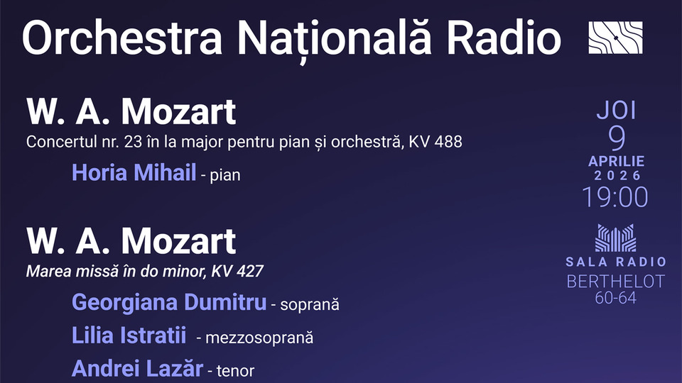 În așteptarea Paștelui, în Joia Mare, 9 aprilie 2026 - de la 19.00, Orchestra Națională Radio, sub bagheta dirijorului Radu Popa, ne invită la o seară specială, un eveniment 100% Mozart în care muzica va răsuna la Sala Radio ca într-o catedrală. Vom asculta celebra lucrare semnată de Amadeus: Marea missă în do minor, una dintre cele mai impresionante și enigmatice creații sacre ale compozitorului, o partitură monumentală, profund dramatică și, paradoxal, neterminată.