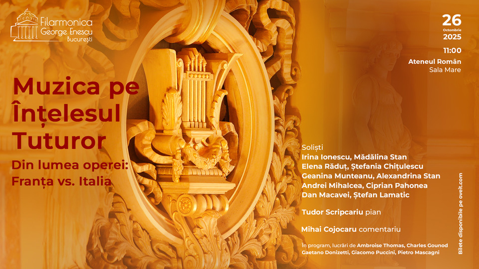 Filarmonica "George Enescu" propune astăzi, 26 octombrie 2025, un concert educativ din seria "Muzica pe înțelesul tuturor", intitulat "Din lumea operei: Franța vs. Italia".