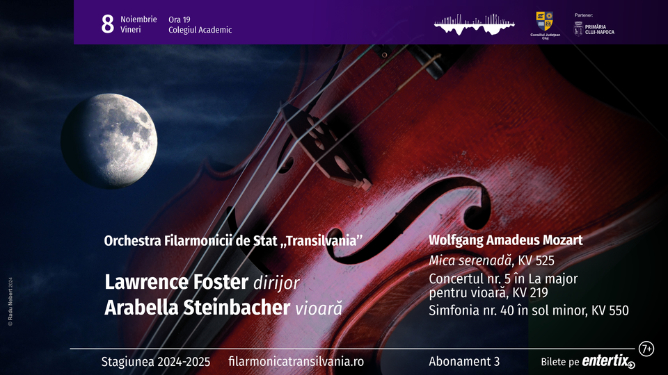 Vineri, 8 noiembrie 2024, dirijorul Emerit al Orchestrei Filarmonicii de Stat "Transilvania", Lawrence Foster, revine la pupitrul dirijoral pentru o seară dedicată lui Mozart, în programul serii regăsind-se Mica serenadă, KV 525, Concertul nr. 5 în La major pentru vioară, KV 219 și Simfonia nr. 40 în sol minor, KV 550. Solistă va fi violonista Arabella Steinbacher. Concertul va avea loc la Colegiul Academic începând cu ora 19.00.