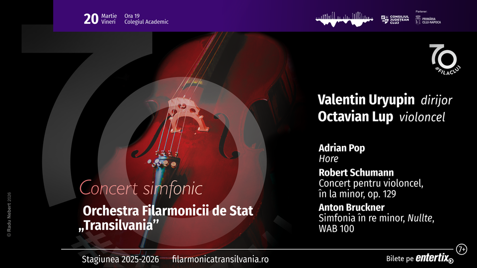 Unul dintre reprezentanții cei mai importanți ai tinerei generații de violonceliști din România, Octavian Lup, va fi prezent vineri, 20 martie 2026, ora 19.00 / Colegiul Academic, pe scena sălii Auditorium Maximum pentru a interpreta Robert Schumann - Concert pentru violoncel, în la minor, op. 129 alături de Orchestra Filarmonicii de Stat "Transilvania", sub bagheta dirijorului Valentin Uryupin. Din programul serii vor mai face parte lucrări semnate de compozitorul clujean Adrian Pop și de Anton Bruckner.