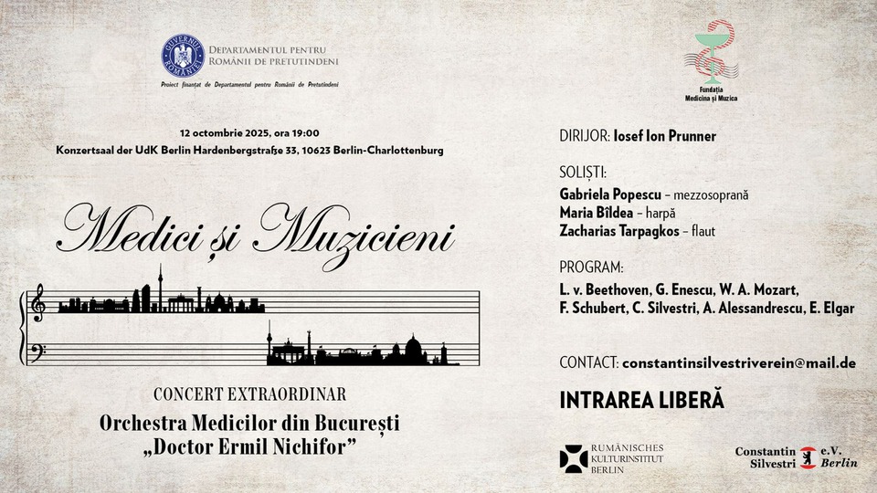 Orchestra Medicilor "Dr. Ermil Nichifor" din București, condusă de dirijorul Iosif Ion Prunner, va susține astăzi, 12 octombrie 2025, concertul aniversar intitulat "Medici și Muzicieni", la Sala de concerte a Universității de Muzică și Artele Spectacolului din Berlin.