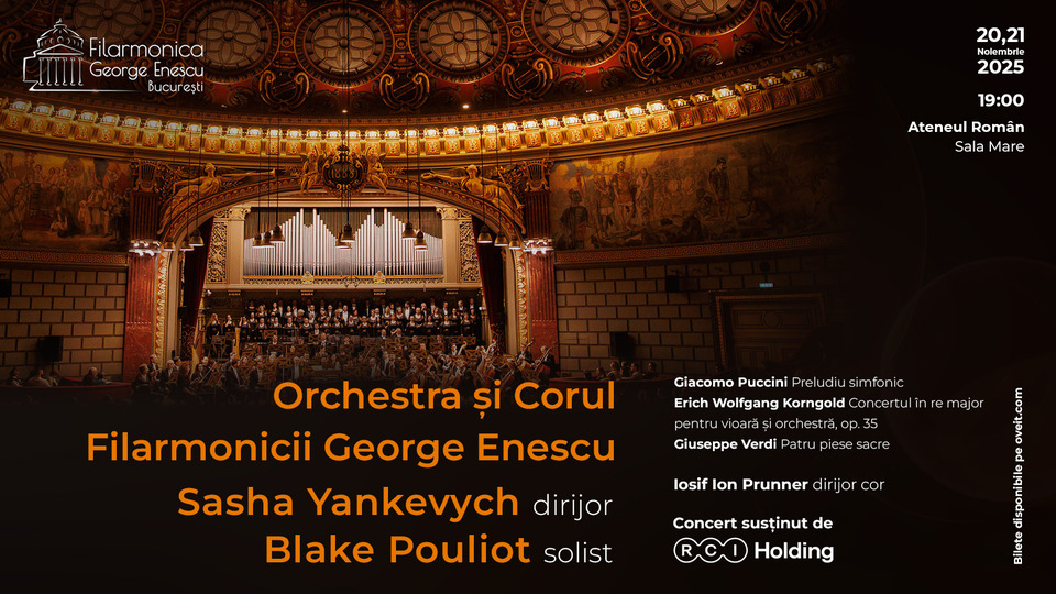 Cu dirijorul Sasha Yankevych și violonistul Blake Pouliot, ca solist, Orchestra și Corul Filarmonicii George Enescu interpretează Puccini, Korngold și Verdi