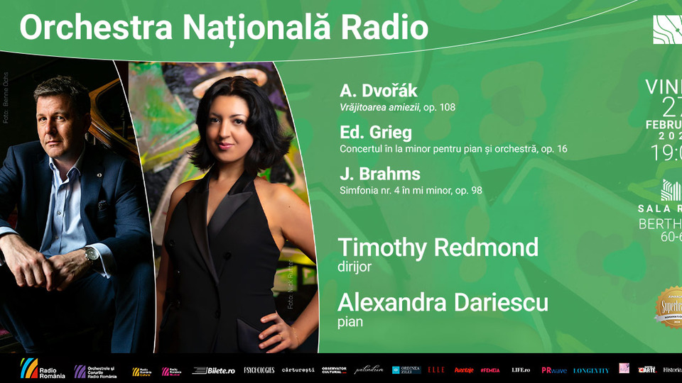 Vineri, 27 februarie 2026 (de la 19.00), vă invităm la concertul prezentat la Sala Radio de cunoscuta pianistă Alexandra Dariescu, alături de Orchestra Națională Radio. Artista este prima pianistă din România care a concertat la Royal Albert Hall (Londra) și a cântat în săli prestigioase precum Carnegie Hall (New York), Musikverein și Konzerthaus (Viena), BOZAR Brussels, Staatsoper Berlin, Hamburg Laeiszhalle, Sydney Opera House, Beijing National Centre for Performing Arts, Shanghai Grand Opera, Tokyo Musashino Hall, Dubai Opera și multe altele. Sub bagheta dirijorului britanic Timothy Redmond, artista va interpreta celebrul Concert în la minor pentru pian și orchestră compus de Grieg.