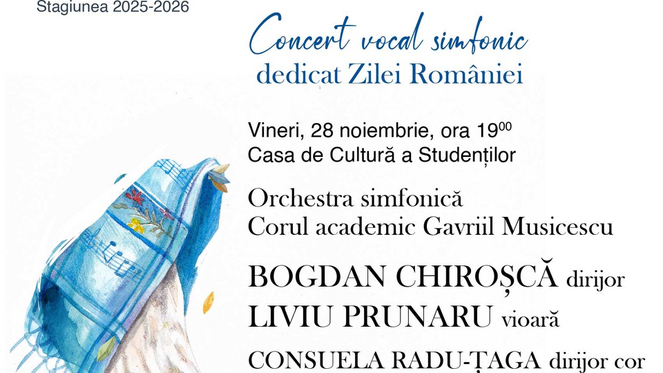 Vineri, 28 noiembrie 2025, ora 19:00 - Casa de Cultură a Studenților Iași - Concert vocal-simfonic dedicat Zilei României