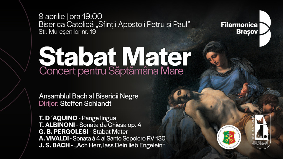 Punctul central al serii este lucrarea Stabat Mater de Giovanni Battista Pergolesi, o capodoperă a muzicii sacre baroce, compusă în ultimele săptămâni din viața autorului, care surprinde suferința Fecioarei Maria la cruce printr-un limbaj sensibil și profund uman. Programul este completat de imnul Pange lingua, precum și de corala finală din Patimile după Ioan de Bach, Ach Herr, lass Dein lieb Engelein, un moment de liniște și speranță care închide simbolic drumul de la suferință la mântuire. Numărul de locuri pentru acest eveniment este limitat, iar biletele pot fi achiziționate de la casieria Filarmonicii Brașov sau online pe bilet.ro.