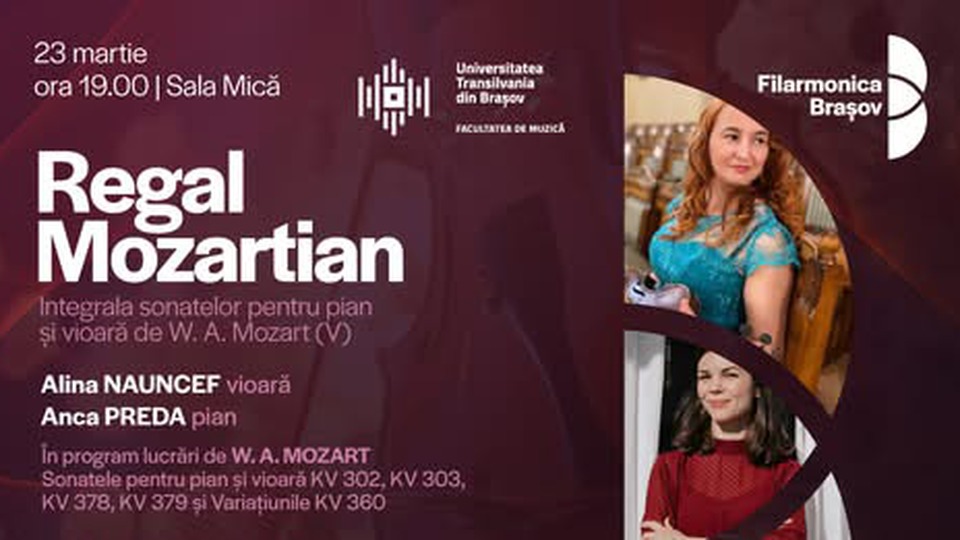 Astăzi, 23 martie 2026, la Sala mică a Filarmonicii din Brașov continuă seria în cadrul căreia violonista Alina Nauncef și pianista Anca Preda prezintă integrala Sonatelor pentru vioară și pian de Wolfgang Amadeus Mozart.