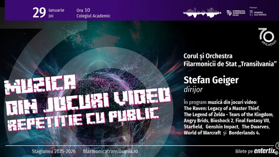 Orchestra și Corul Filarmonicii "Transilvania" propun astăzi, 30 ianuarie 2026, un program cu muzică din jocuri video de mare succes în cadrul unui concert desfășurat la Colegiul Academic din Cluj-Napoca.