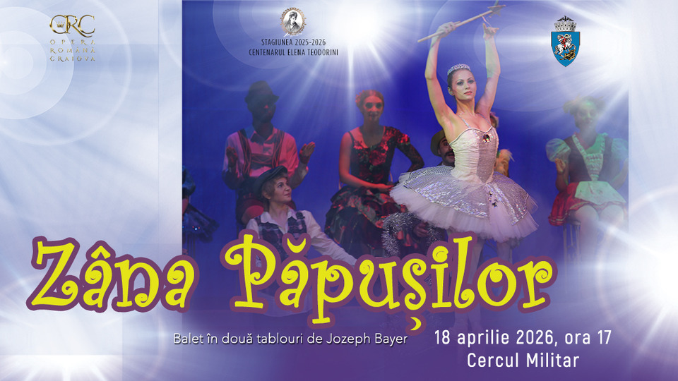 Opera Română din Craiova prezintă astăzi, 18 aprilie 2026, spectacolul de balet „Zâna păpușilor” de Josef Bayer, dedicat copiilor. Regia artistică și coregrafia poartă semnătura lui Francisc Valkay, iar scenografia este realizată de Răsvan Drăgănescu. Printre balerinii care vor da viață personajelor se numără Olguța Ilie, Anca Țecu, Robert Vladu, Loredana Nicola și Alexandru Chera. Evenimentul are loc cu participarea ansamblului de balet al Operei Române Craiova și se desfășoară pe un fundal sonor înregistrat. Publicul este așteptat la ora 17.00, la Cercul Militar din localitate.