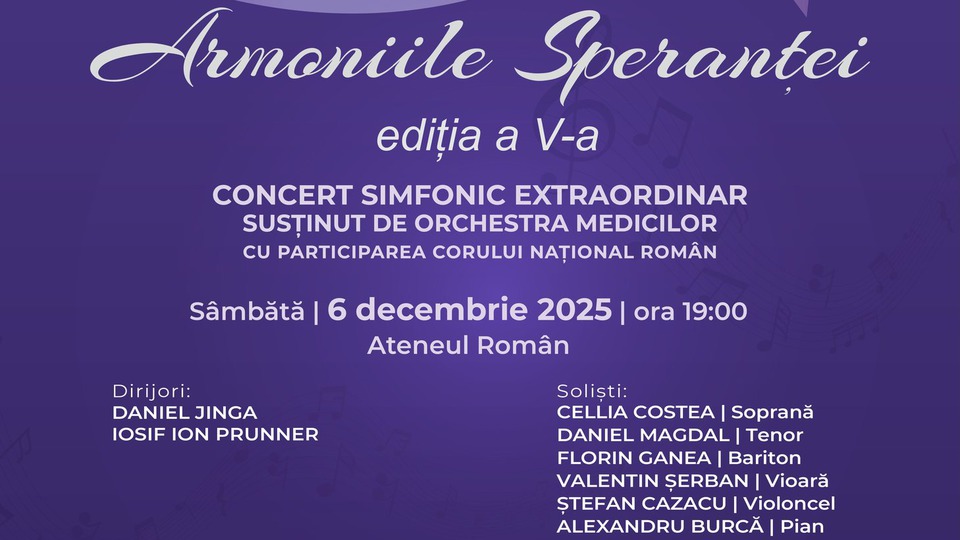 Orchestra Medicilor din România va susține astăzi, 6 decembrie 2025, de la ora 19:00, un concert caritabil în Sala Mare a Ateneului Român, în sprijinul pacienților oncologici.